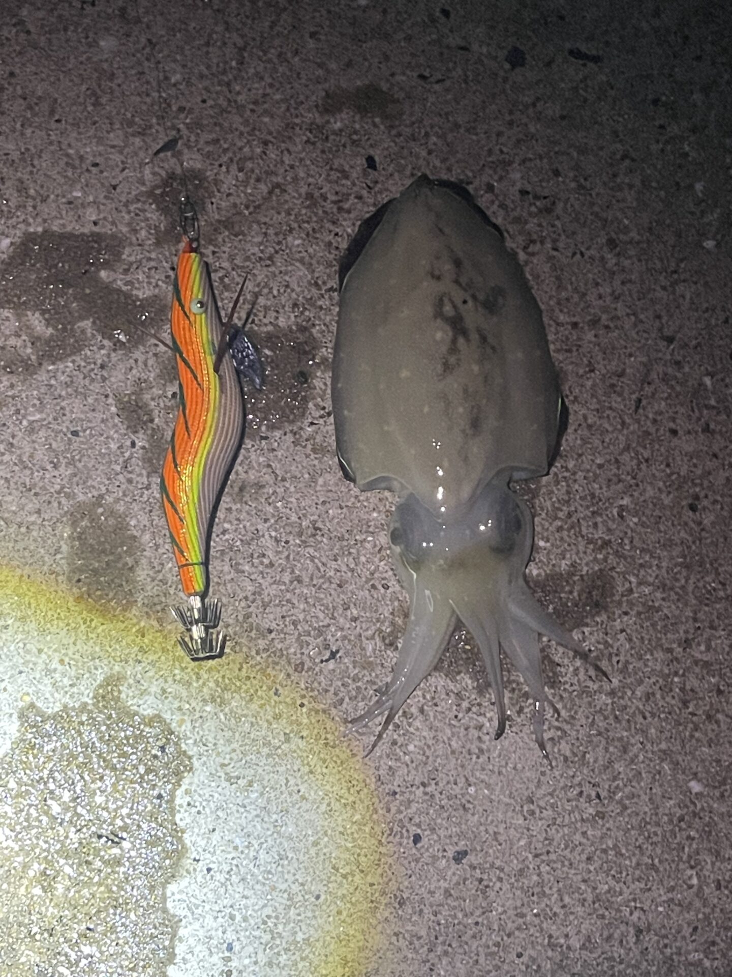 釣り開始から約9時間ようやくイカのアタリです。嬉しさが爆発して叫びそうでしたが(笑)、グッとこらえてイカを寄せてきます。
